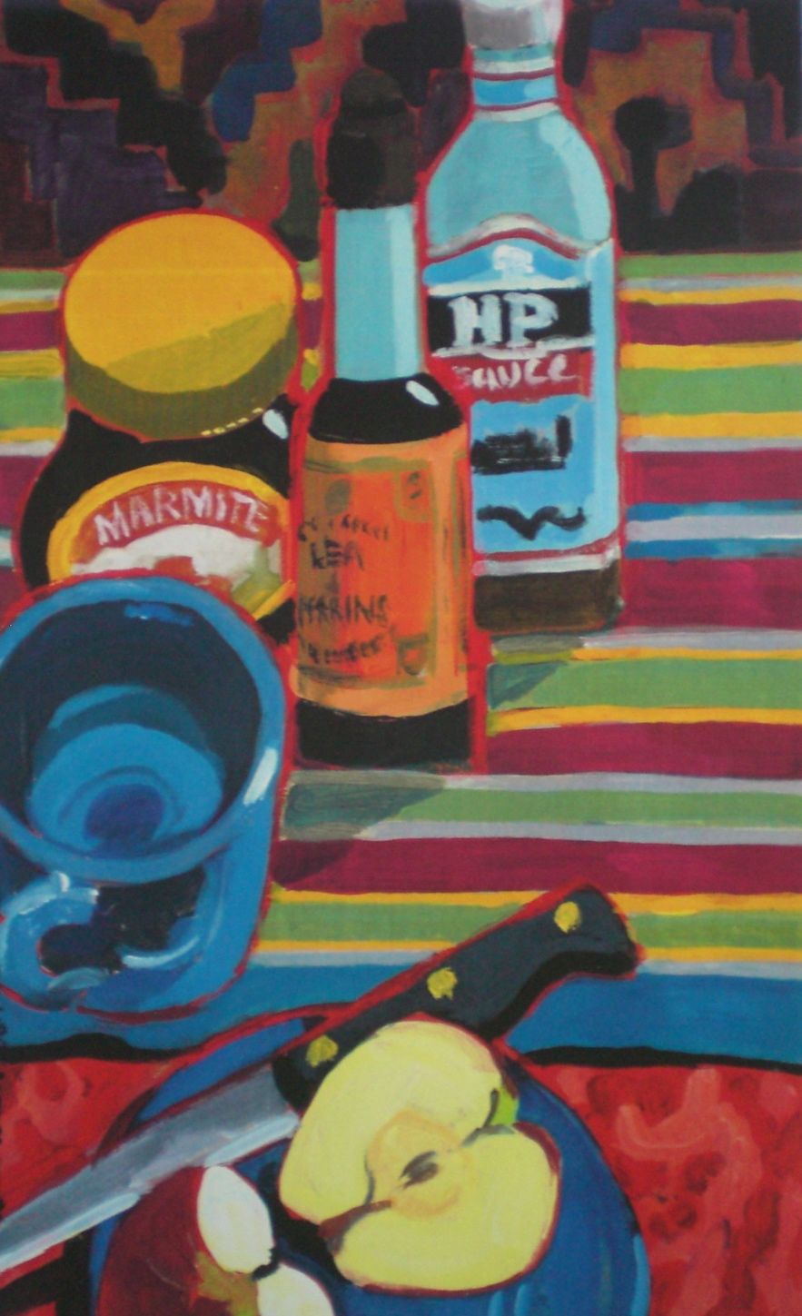 On the theme of kitchenalia, here’s another one featuring the knife and apple. I loved the drawings and painting of my tutor at art school, the late Tom Fairs, and the knife and apple is homage to his still lives. I wish I had 10% of his talent, 5% even. He was the most amazingly clever and inspiring man, and a wonderful artist and stained glass craftsman. His paintings are absolutely beautiful, have a look.
