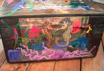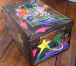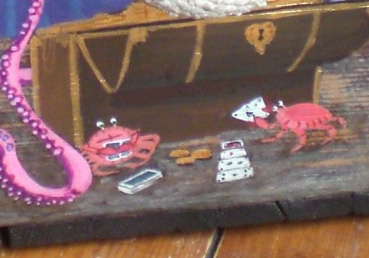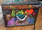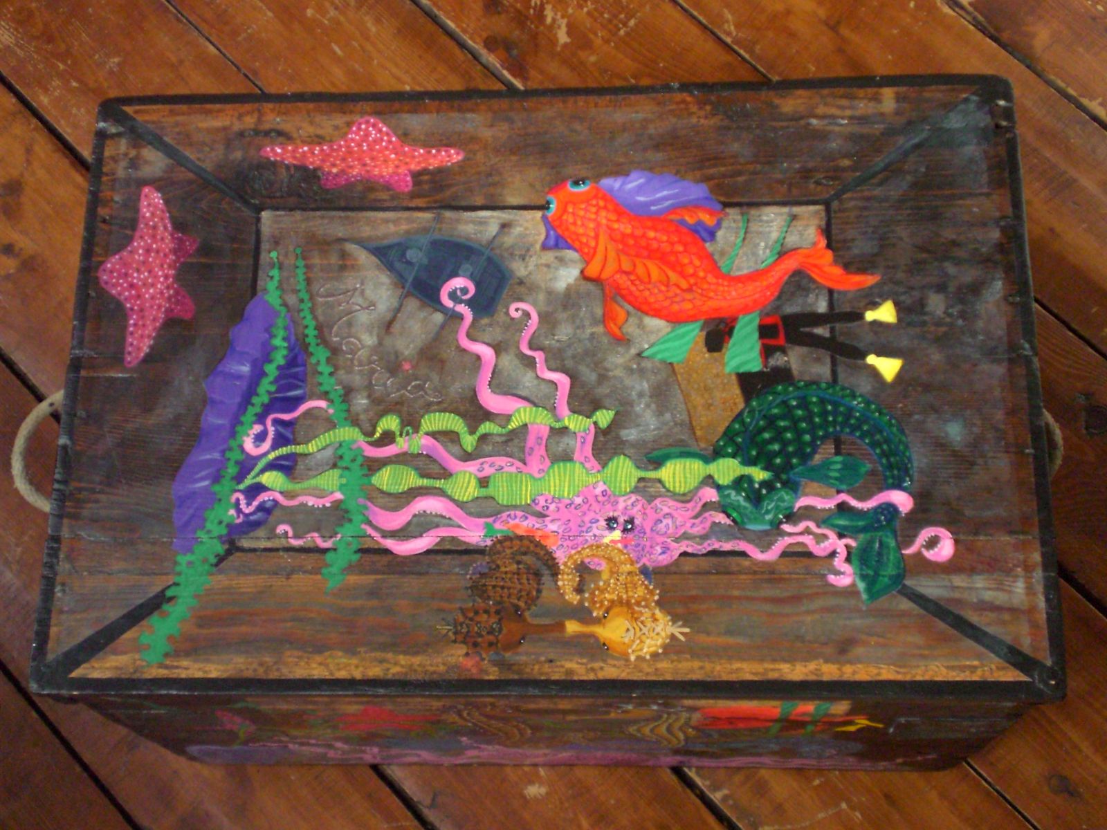 This battered old box was earmarked for a skip outside a worshipful company in the City of London. (Actually the one devoted to fish-mongering, so an appropriate use of it, now I think about it.) One awkward tube journey home later I decided that its destiny had to be as a fun artwork. So I made a wooden box into a glass fish tank full of the usual things, a mermaid (red headed after its eventual owner of course), an octopus, starfish, sea horses, a diver (about to rescue the imperiled mermaid) card playing crabs and all. The sides of the wooden box being ‘glass’ you can see all that’s going on from each point of view, with hidden surprises on each side. The box is about 2 x 1 1/2 x 1 feet, or about 60 x 45 x 33 cm.