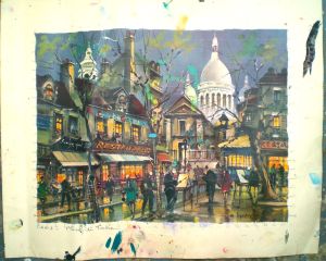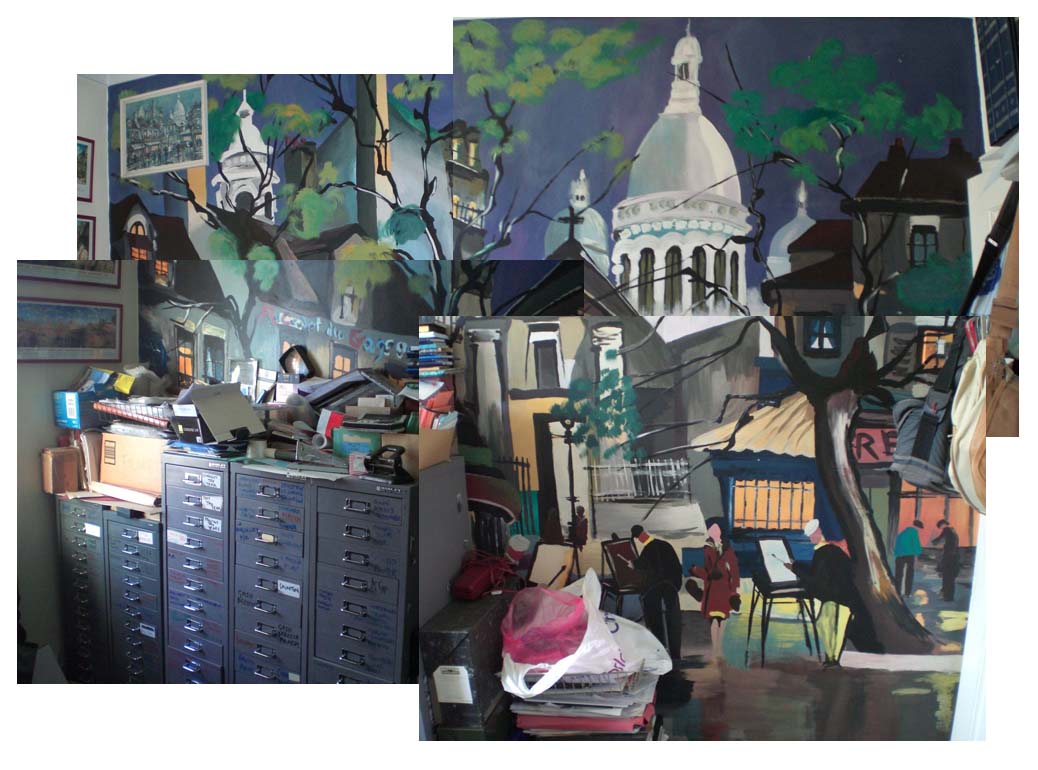 This is a mural I did as a teenager – in my old bedroom. Quite a feat looking back. I loved Paris and someone taught me how to blow up an image, well, my favourite picture of the place by M. Fegendrey, Place du Tertre, a rainy evening in spring, (summer?) got the treatment. It’s just a tiny bit kitch, but I like it. I can’t show it looking pristine, it’s the wall of an office now, hence junk (sorry). The point is, as I did with theatrical scene painting years later, I can blow things up.