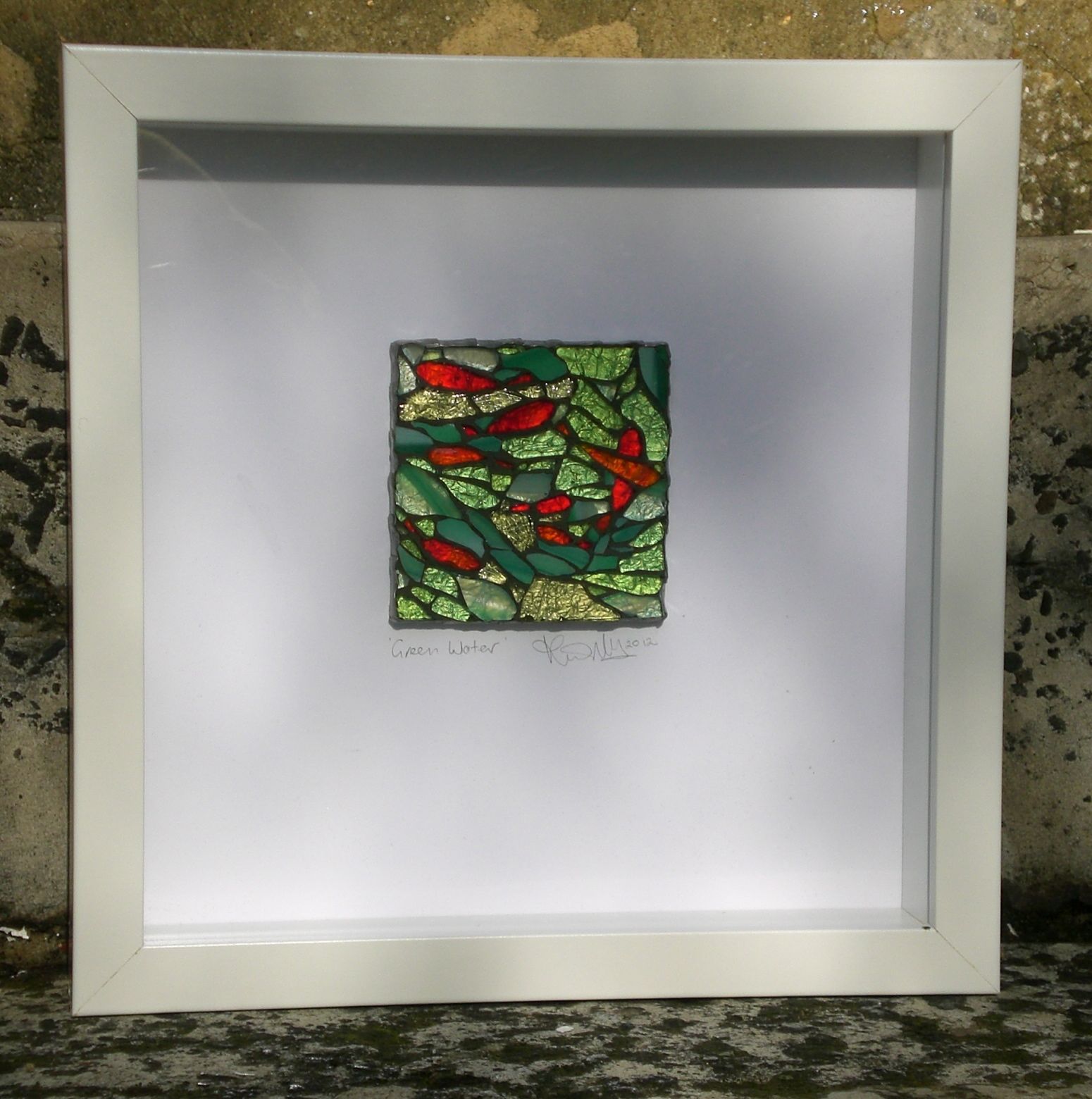 My first experiment into a framed small but detailed mosaic. Nice frame eh? Thanks Professor Ikea, nice one. The red fish are in glistening green glass water, the square is lined with thin silver foil before applying the glass. I see this one gracing a leafy conservatory somewhere. But I will not complain if you’d like to have it in your bathroom. It’s all good. Now SOLD.