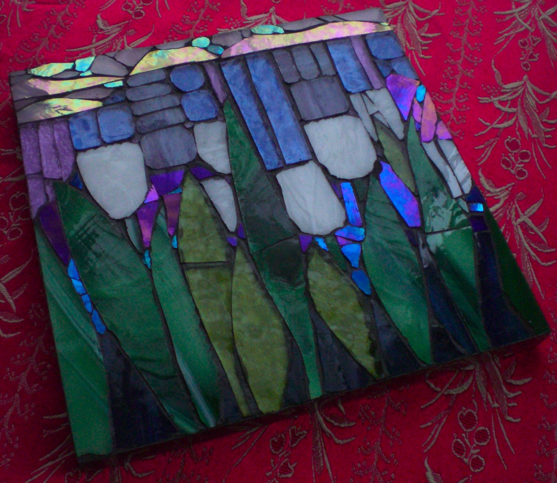 This trivet/wall piece contains two unusual things, I’ve used big pieces of glass that is beautifully swirly in it’s own right – I couldn’t break that up too much, so I allowed it to suggest the form of tulip leaves – click on the image to enlarge it if you want to see detail of that. It’s also got pieces of that pinky lilac colour, which costs a fortune BTW, and is a new colour for me to play with. There’s a lot of iridescence not picked up by the flat on view so another image below shows this more clearly. This piece is 8″ x 8″ , please do get in touch if you’d like me to make you something flowery.