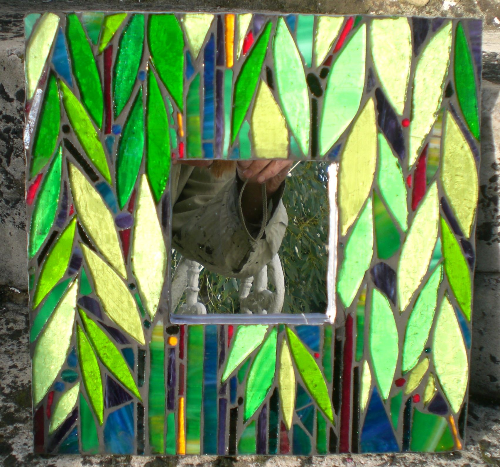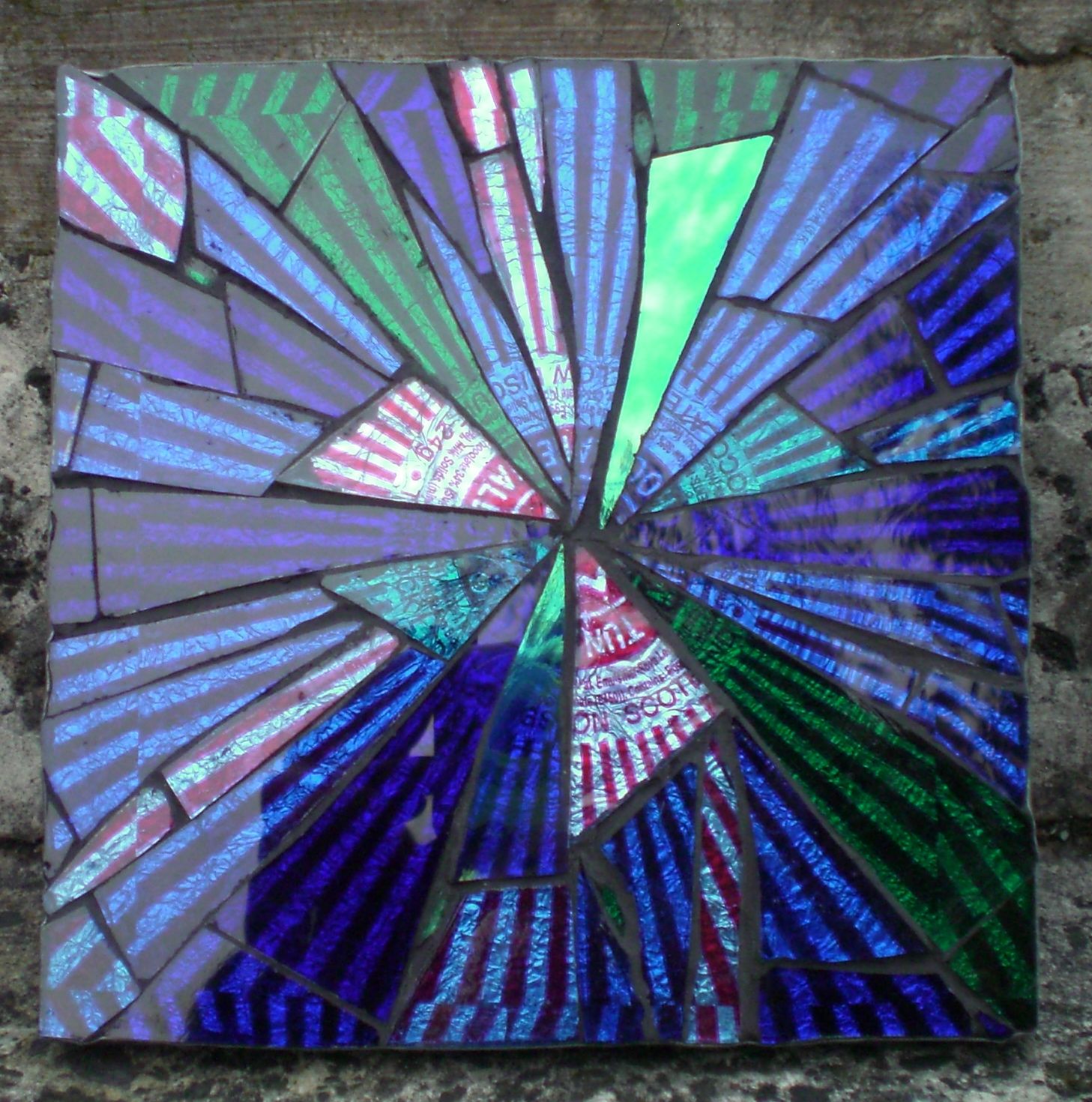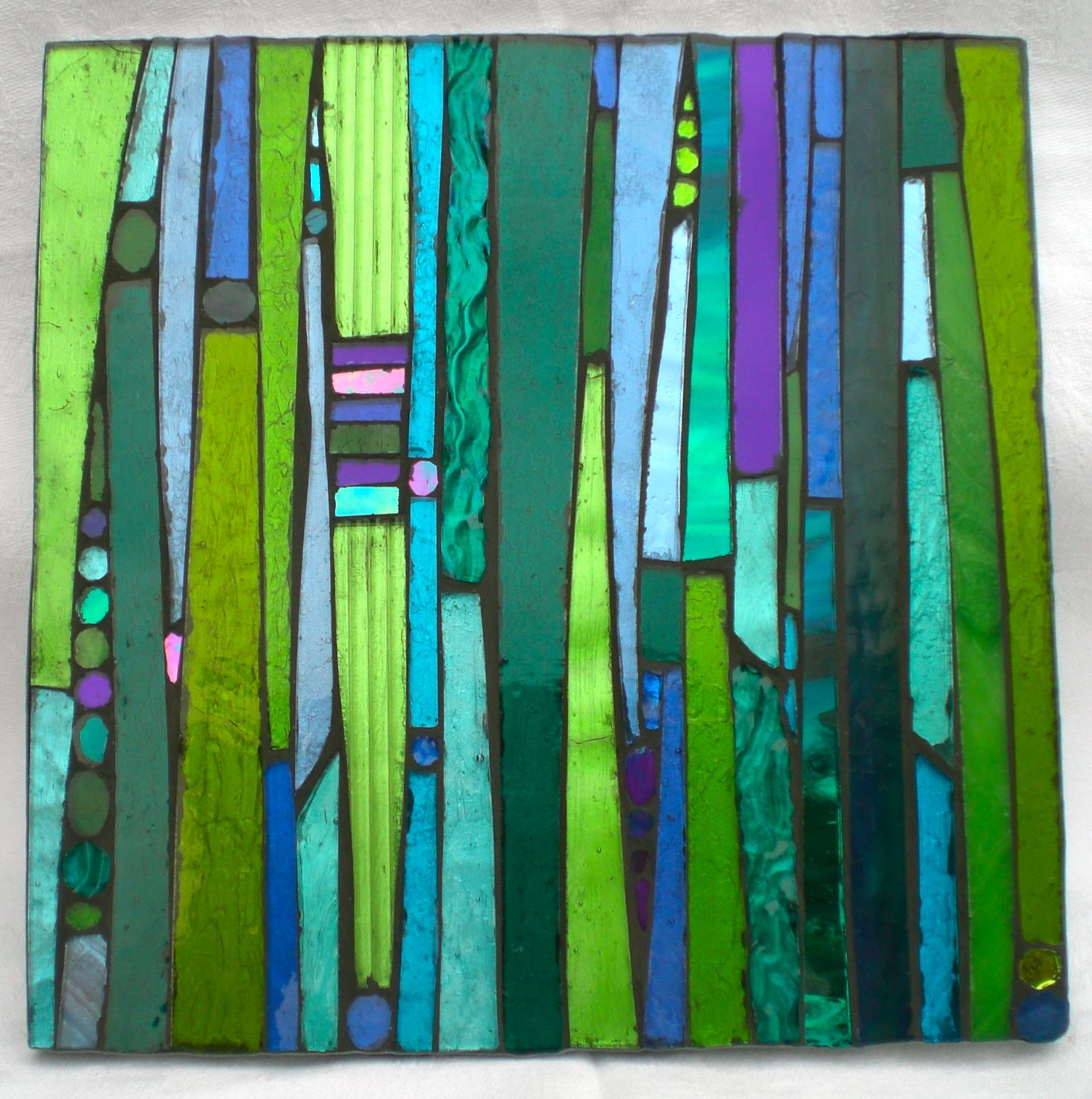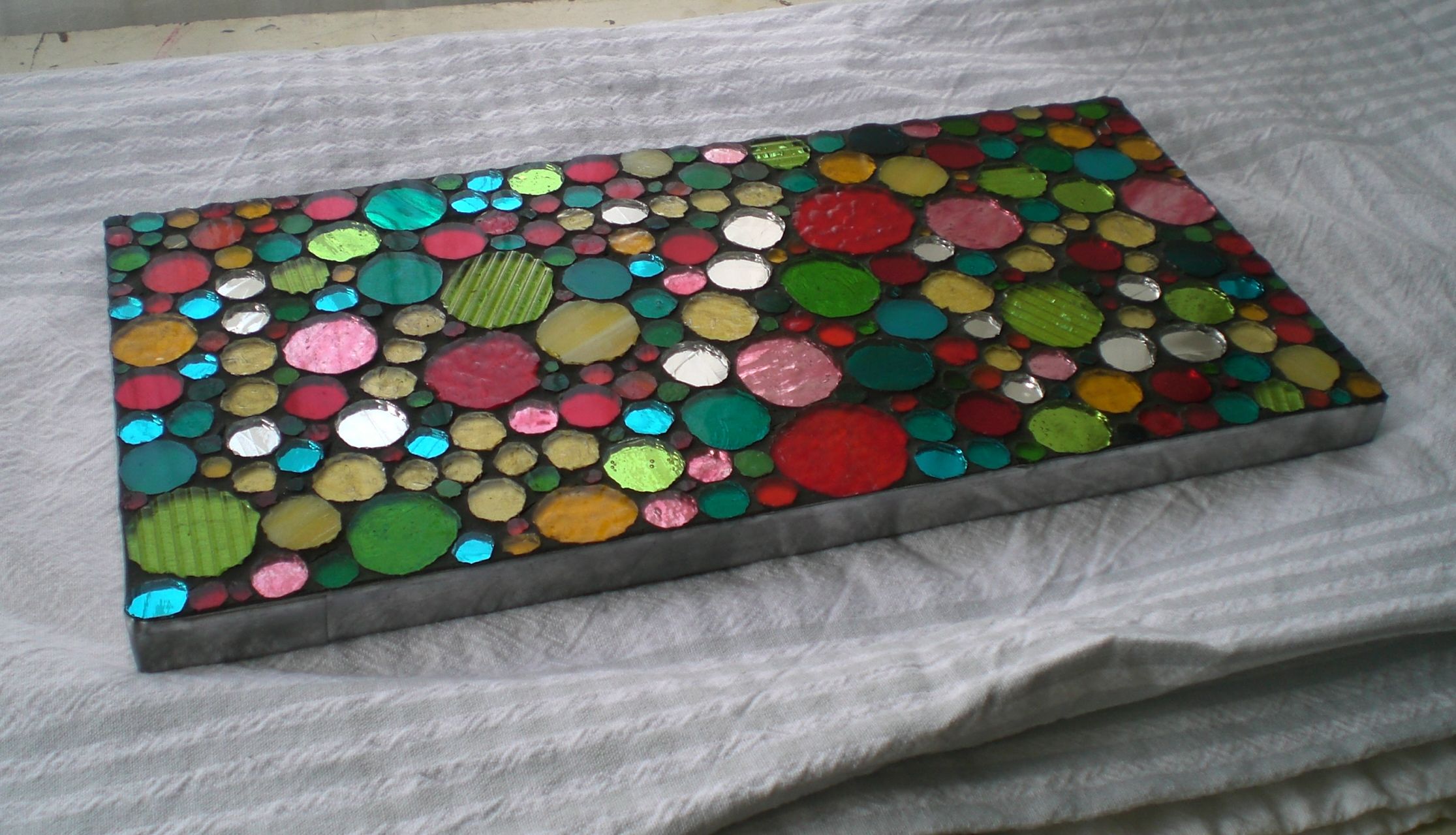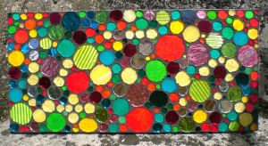 Nearly called this one the colour blindness test trivet. There’s a message in that trivet…look closely, or maybe look further awayly….it’s a date, 14.7.12, the wedding date of its owners. No more help. It’s all round cut stained glass, on a board that’s 6″ x 12″ and looks different in different light of course, so here’s another picture.