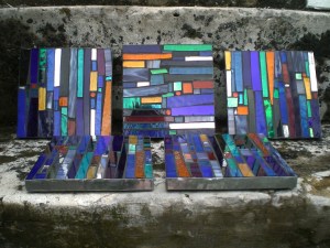 This is an experiment. I wanted to see what I could make in a day, (long day, more like two days in fact) to keep the price of a handmade mosaic to the minimum, without compromising on the quality, look or merit of the work. So I made these in what amounts to a long day, and I think they look pretty smart. They are 6″ x 6″, enough for a hot pan, and I was hoping had a sort of retro 50s look to them. They are cut from the same mixture of glass, but each is unique.