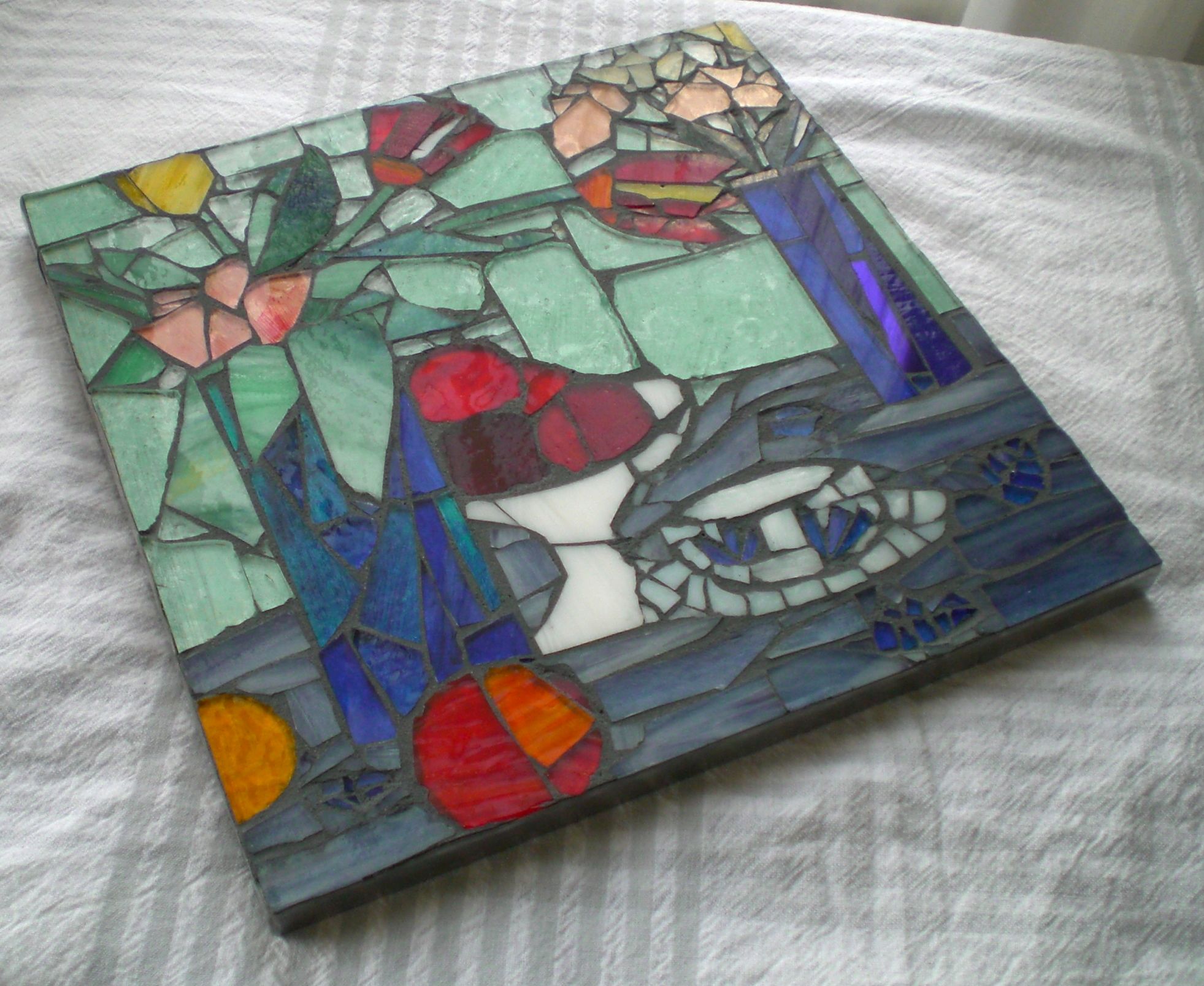 A commissioned birthday treat trivet for a fan of Scottish Colourists, this is 10″ x 10″ stained glass on board with a slightly blue grout. It’s homage to this beautiful (record breaking apparently) still life by Peploe and I have to say the style with the heavy outlines and flat plain approach lends itself to mosaic. What a pleasure to absorb the elements of a Peploe still life, the vase, the tulips, the fruit and the lovely colours of course. I love a commission for someone who knows what they like, it’s a challenge and always a pleasure to have a place to start. Here it is in a different light.
