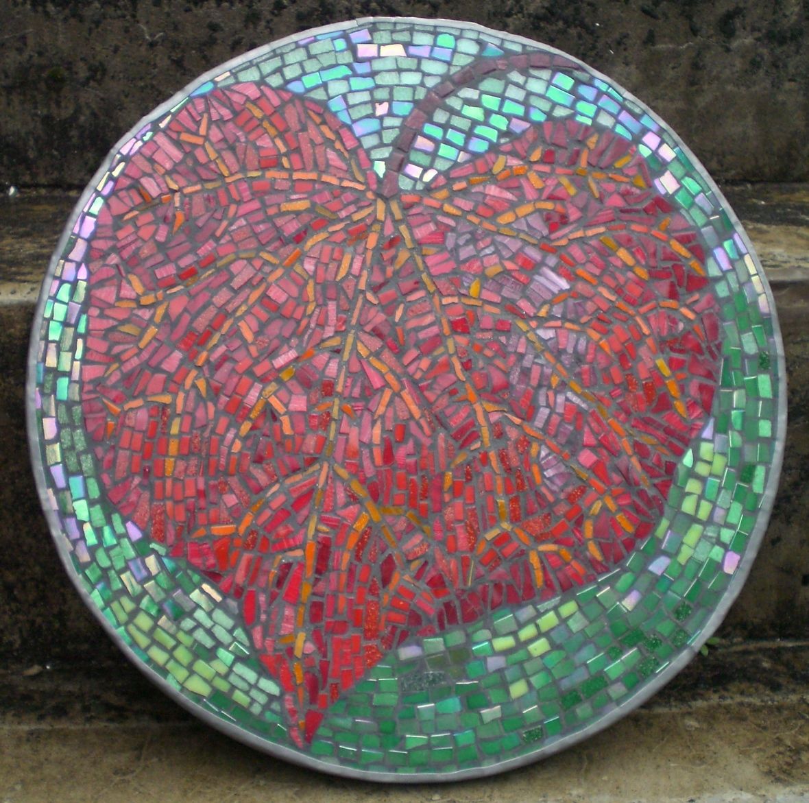 Glass mosaic of a leaf, inspiration below. As with other iridescent mosaics it looks completly different in different lights, so here’s two versions anyway. It was a challenging subject, the leaf was a beautiful colour, and very intricate and subtle. I had to use sixths of a tile to feel like I’d got the scale right, so it looks fairly randomly organised. I bought some yacht varnish for the back as it’s going to be hung up outside. I explained to the man in the sailing fandangle shop that I didn’t have a yacht, I think that may have been unnecessary on reflection.